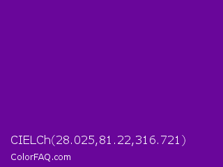 CIELCh 28.025,81.22,316.721 Color is a normal purple color and the nearest color is Purple #660099. Hex code #69069a and RGB value is rgb(105,6,154). In RGB color space, this color is composed of 41% red, 2% green, 60% blue, In CMYK color space, this color is composed of 32% cyan, 96% magenta, 0% yellow , 40% black , In HSL color space, this color has a hue angle of 280° , 93% saturation and 31% lightness.
