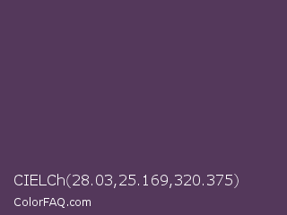 CIELCh 28.03,25.169,320.375 Color is a dark purple color and the nearest color is English Violet #563c5c. Hex code #54385b and RGB value is rgb(84,56,91). In RGB color space, this color is composed of 33% red, 22% green, 36% blue, In CMYK color space, this color is composed of 8% cyan, 38% magenta, 0% yellow , 64% black , In HSL color space, this color has a hue angle of 288° , 24% saturation and 29% lightness.