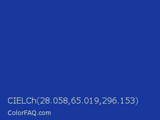 CIELCh 28.058,65.019,296.153 Color is a normal blue color and the nearest color is Egyptian Blue #1034a6. Hex code #17389e and RGB value is rgb(23,56,158). In RGB color space, this color is composed of 9% red, 22% green, 62% blue, In CMYK color space, this color is composed of 85% cyan, 65% magenta, 0% yellow , 38% black , In HSL color space, this color has a hue angle of 225° , 75% saturation and 35% lightness.