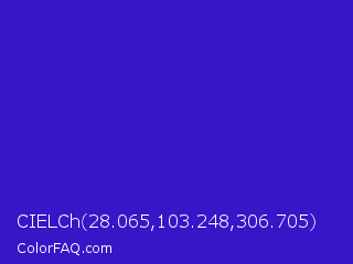 CIELCh 28.065,103.248,306.705 Color is a normal indigo color and the nearest color is Interdimensional Blue #360ccc. Hex code #3616c7 and RGB value is rgb(54,22,199). In RGB color space, this color is composed of 21% red, 9% green, 78% blue, In CMYK color space, this color is composed of 73% cyan, 89% magenta, 0% yellow , 22% black , In HSL color space, this color has a hue angle of 251° , 80% saturation and 43% lightness.