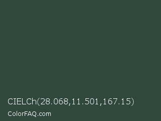 CIELCh 28.068,11.501,167.15 Color is a dark green color and the nearest color is Lunar Green #3c493a. Hex code #30473e and RGB value is rgb(48,71,62). In RGB color space, this color is composed of 19% red, 28% green, 24% blue, In CMYK color space, this color is composed of 32% cyan, 0% magenta, 13% yellow , 72% black , In HSL color space, this color has a hue angle of 157° , 19% saturation and 23% lightness.