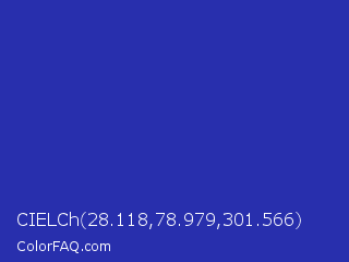 CIELCh 28.118,78.979,301.566 Color is a normal blue color and the nearest color is Governor Bay #2f3cb3. Hex code #282fad and RGB value is rgb(40,47,173). In RGB color space, this color is composed of 16% red, 18% green, 68% blue, In CMYK color space, this color is composed of 77% cyan, 73% magenta, 0% yellow , 32% black , In HSL color space, this color has a hue angle of 237° , 62% saturation and 42% lightness.