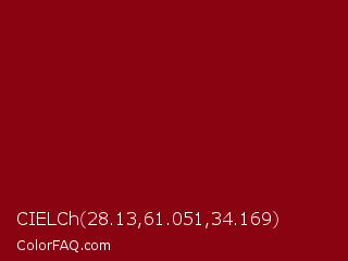 CIELCh 28.13,61.051,34.169 Color is a dark red color and the nearest color is Red Devil #860111. Hex code #8a0310 and RGB value is rgb(138,3,16). In RGB color space, this color is composed of 54% red, 1% green, 6% blue, In CMYK color space, this color is composed of 0% cyan, 98% magenta, 88% yellow , 46% black , In HSL color space, this color has a hue angle of 354° , 96% saturation and 28% lightness.