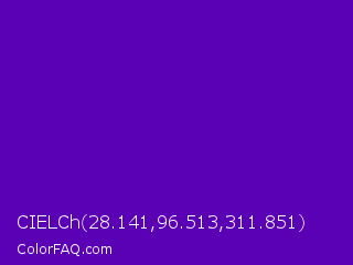 CIELCh 28.141,96.513,311.851 Color is a normal violet color and the nearest color is Purple #660099. Hex code #5a00b5 and RGB value is rgb(90,0,181). In RGB color space, this color is composed of 35% red, 0% green, 71% blue, In CMYK color space, this color is composed of 50% cyan, 100% magenta, 0% yellow , 29% black , In HSL color space, this color has a hue angle of 270° , 100% saturation and 35% lightness.