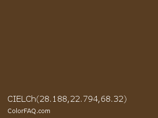 CIELCh 28.188,22.794,68.32 Color is a dark orange color and the nearest color is Irish Coffee #5f3d26. Hex code #583d22 and RGB value is rgb(88,61,34). In RGB color space, this color is composed of 35% red, 24% green, 13% blue, In CMYK color space, this color is composed of 0% cyan, 31% magenta, 61% yellow , 65% black , In HSL color space, this color has a hue angle of 30° , 44% saturation and 24% lightness.