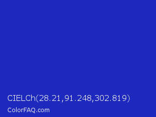 CIELCh 28.21,91.248,302.819 Color is a normal blue color and the nearest color is Persian Blue #1c39bb. Hex code #1e29bd and RGB value is rgb(30,41,189). In RGB color space, this color is composed of 12% red, 16% green, 74% blue, In CMYK color space, this color is composed of 84% cyan, 78% magenta, 0% yellow , 26% black , In HSL color space, this color has a hue angle of 236° , 73% saturation and 43% lightness.
