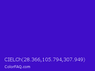 CIELCh 28.366,105.794,307.949 Color is a normal indigo color and the nearest color is Interdimensional Blue #360ccc. Hex code #400dc9 and RGB value is rgb(64,13,201). In RGB color space, this color is composed of 25% red, 5% green, 79% blue, In CMYK color space, this color is composed of 68% cyan, 94% magenta, 0% yellow , 21% black , In HSL color space, this color has a hue angle of 256° , 88% saturation and 42% lightness.