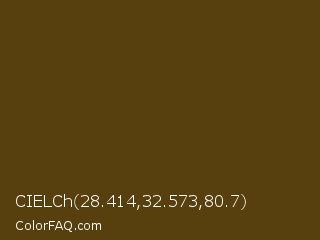 CIELCh 28.414,32.573,80.7 Color is a very dark orange color and the nearest color is Pineapple #563c0d. Hex code #573f0e and RGB value is rgb(87,63,14). In RGB color space, this color is composed of 34% red, 25% green, 5% blue, In CMYK color space, this color is composed of 0% cyan, 28% magenta, 84% yellow , 66% black , In HSL color space, this color has a hue angle of 40° , 72% saturation and 20% lightness.