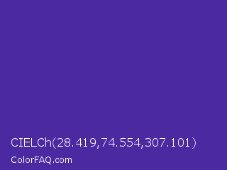 CIELCh 28.419,74.554,307.101 Color is a normal indigo color and the nearest color is Daisy Bush #4f2398. Hex code #4a29a1 and RGB value is rgb(74,41,161). In RGB color space, this color is composed of 29% red, 16% green, 63% blue, In CMYK color space, this color is composed of 54% cyan, 75% magenta, 0% yellow , 37% black , In HSL color space, this color has a hue angle of 257° , 59% saturation and 40% lightness.