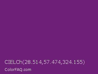 CIELCh 28.514,57.474,324.155 Color is a dark magenta color and the nearest color is Midnight #702670. Hex code #6e1f78 and RGB value is rgb(110,31,120). In RGB color space, this color is composed of 43% red, 12% green, 47% blue, In CMYK color space, this color is composed of 8% cyan, 74% magenta, 0% yellow , 53% black , In HSL color space, this color has a hue angle of 293° , 59% saturation and 30% lightness.