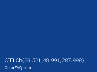 CIELCh 28.521,48.991,287.998 Color is a dark blue color and the nearest color is Congress Blue #02478e. Hex code #0e408c and RGB value is rgb(14,64,140). In RGB color space, this color is composed of 5% red, 25% green, 55% blue, In CMYK color space, this color is composed of 90% cyan, 54% magenta, 0% yellow , 45% black , In HSL color space, this color has a hue angle of 216° , 82% saturation and 30% lightness.