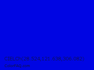 CIELCh 28.524,121.638,306.082 Color is a normal blue color and the nearest color is Medium Blue #0000cd. Hex code #0005e3 and RGB value is rgb(0,5,227). In RGB color space, this color is composed of 0% red, 2% green, 89% blue, In CMYK color space, this color is composed of 100% cyan, 98% magenta, 0% yellow , 11% black , In HSL color space, this color has a hue angle of 239° , 100% saturation and 45% lightness.