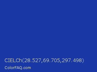 CIELCh 28.527,69.705,297.498 Color is a normal blue color and the nearest color is Egyptian Blue #1034a6. Hex code #1937a5 and RGB value is rgb(25,55,165). In RGB color space, this color is composed of 10% red, 22% green, 65% blue, In CMYK color space, this color is composed of 85% cyan, 67% magenta, 0% yellow , 35% black , In HSL color space, this color has a hue angle of 227° , 74% saturation and 37% lightness.