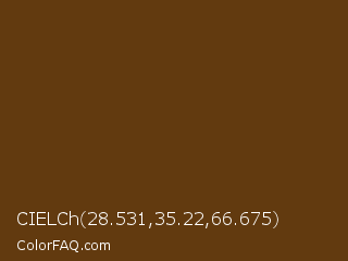 CIELCh 28.531,35.22,66.675 Color is a very dark orange color and the nearest color is Pullman Brown UPS Brown #644117. Hex code #623a0f and RGB value is rgb(98,58,15). In RGB color space, this color is composed of 38% red, 23% green, 6% blue, In CMYK color space, this color is composed of 0% cyan, 41% magenta, 85% yellow , 62% black , In HSL color space, this color has a hue angle of 31° , 73% saturation and 22% lightness.