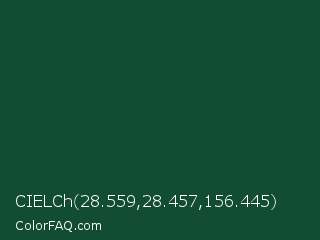 CIELCh 28.559,28.457,156.445 Color is a very dark green color and the nearest color is Cal Poly Pomona Green #1e4d2b. Hex code #134d31 and RGB value is rgb(19,77,49). In RGB color space, this color is composed of 7% red, 30% green, 19% blue, In CMYK color space, this color is composed of 75% cyan, 0% magenta, 36% yellow , 70% black , In HSL color space, this color has a hue angle of 151° , 60% saturation and 19% lightness.