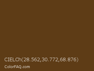 CIELCh 28.562,30.772,68.876 Color is a dark orange color and the nearest color is Pullman Brown UPS Brown #644117. Hex code #5e3c16 and RGB value is rgb(94,60,22). In RGB color space, this color is composed of 37% red, 24% green, 9% blue, In CMYK color space, this color is composed of 0% cyan, 36% magenta, 77% yellow , 63% black , In HSL color space, this color has a hue angle of 32° , 62% saturation and 23% lightness.
