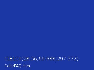 CIELCh 28.56,69.688,297.572 Color is a normal blue color and the nearest color is Egyptian Blue #1034a6. Hex code #1a37a5 and RGB value is rgb(26,55,165). In RGB color space, this color is composed of 10% red, 22% green, 65% blue, In CMYK color space, this color is composed of 84% cyan, 67% magenta, 0% yellow , 35% black , In HSL color space, this color has a hue angle of 227° , 73% saturation and 37% lightness.