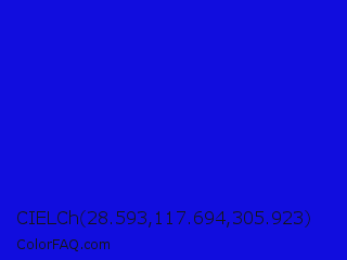 CIELCh 28.593,117.694,305.923 Color is a normal indigo color and the nearest color is Bluebonnet #1c1cf0. Hex code #110dde and RGB value is rgb(17,13,222). In RGB color space, this color is composed of 7% red, 5% green, 87% blue, In CMYK color space, this color is composed of 92% cyan, 94% magenta, 0% yellow , 13% black , In HSL color space, this color has a hue angle of 241° , 89% saturation and 46% lightness.