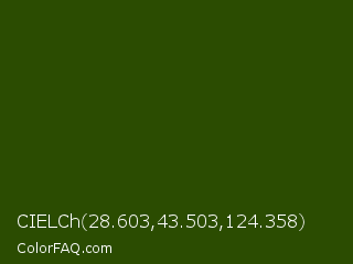 CIELCh 28.603,43.503,124.358 Color is a very dark green color and the nearest color is Green House #24500f. Hex code #2b4c01 and RGB value is rgb(43,76,1). In RGB color space, this color is composed of 17% red, 30% green, 0% blue, In CMYK color space, this color is composed of 43% cyan, 0% magenta, 99% yellow , 70% black , In HSL color space, this color has a hue angle of 86° , 97% saturation and 15% lightness.