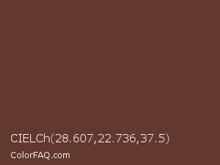 CIELCh 28.607,22.736,37.5 Color is a dark red color and the nearest color is Quincy #623f2d. Hex code #63382f and RGB value is rgb(99,56,47). In RGB color space, this color is composed of 39% red, 22% green, 18% blue, In CMYK color space, this color is composed of 0% cyan, 43% magenta, 53% yellow , 61% black , In HSL color space, this color has a hue angle of 10° , 36% saturation and 29% lightness.