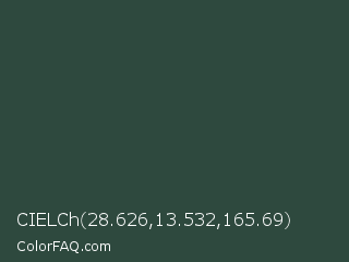 CIELCh 28.626,13.532,165.69 Color is a dark green color and the nearest color is Japanese Indigo #264348. Hex code #2e493e and RGB value is rgb(46,73,62). In RGB color space, this color is composed of 18% red, 29% green, 24% blue, In CMYK color space, this color is composed of 37% cyan, 0% magenta, 15% yellow , 71% black , In HSL color space, this color has a hue angle of 156° , 23% saturation and 23% lightness.