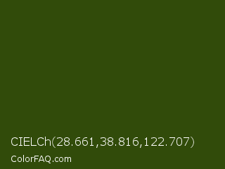 CIELCh 28.661,38.816,122.707 Color is a very dark green color and the nearest color is Clover #384910. Hex code #314b0a and RGB value is rgb(49,75,10). In RGB color space, this color is composed of 19% red, 29% green, 4% blue, In CMYK color space, this color is composed of 35% cyan, 0% magenta, 87% yellow , 71% black , In HSL color space, this color has a hue angle of 84° , 76% saturation and 17% lightness.