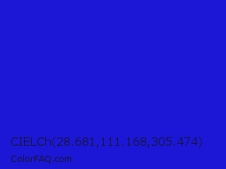 CIELCh 28.681,111.168,305.474 Color is a normal indigo color and the nearest color is Bluebonnet #1c1cf0. Hex code #1c17d6 and RGB value is rgb(28,23,214). In RGB color space, this color is composed of 11% red, 9% green, 84% blue, In CMYK color space, this color is composed of 87% cyan, 89% magenta, 0% yellow , 16% black , In HSL color space, this color has a hue angle of 242° , 81% saturation and 46% lightness.