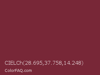 CIELCh 28.695,37.758,14.248 Color is a normal red color and the nearest color is Wine #722f37. Hex code #782737 and RGB value is rgb(120,39,55). In RGB color space, this color is composed of 47% red, 15% green, 22% blue, In CMYK color space, this color is composed of 0% cyan, 68% magenta, 54% yellow , 53% black , In HSL color space, this color has a hue angle of 348° , 51% saturation and 31% lightness.
