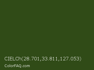 CIELCh 28.701,33.811,127.053 Color is a very dark green color and the nearest color is Clover #384910. Hex code #304b17 and RGB value is rgb(48,75,23). In RGB color space, this color is composed of 19% red, 29% green, 9% blue, In CMYK color space, this color is composed of 36% cyan, 0% magenta, 69% yellow , 71% black , In HSL color space, this color has a hue angle of 91° , 53% saturation and 19% lightness.