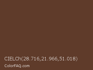 CIELCh 28.716,21.966,51.018 Color is a dark orange color and the nearest color is Irish Coffee #5f3d26. Hex code #5f3b2a and RGB value is rgb(95,59,42). In RGB color space, this color is composed of 37% red, 23% green, 16% blue, In CMYK color space, this color is composed of 0% cyan, 38% magenta, 56% yellow , 63% black , In HSL color space, this color has a hue angle of 19° , 39% saturation and 27% lightness.