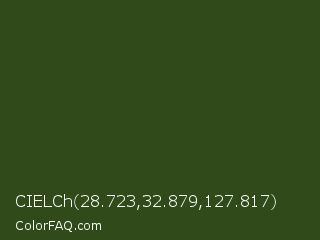 CIELCh 28.723,32.879,127.817 Color is a very dark green color and the nearest color is Clover #384910. Hex code #304b19 and RGB value is rgb(48,75,25). In RGB color space, this color is composed of 19% red, 29% green, 10% blue, In CMYK color space, this color is composed of 36% cyan, 0% magenta, 67% yellow , 71% black , In HSL color space, this color has a hue angle of 92° , 50% saturation and 20% lightness.
