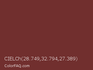 CIELCh 28.749,32.794,27.389 Color is a normal red color and the nearest color is Wine #722f37. Hex code #712f2e and RGB value is rgb(113,47,46). In RGB color space, this color is composed of 44% red, 18% green, 18% blue, In CMYK color space, this color is composed of 0% cyan, 58% magenta, 59% yellow , 56% black , In HSL color space, this color has a hue angle of 1° , 42% saturation and 31% lightness.