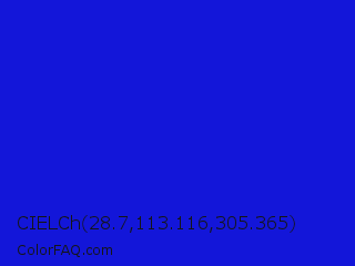 CIELCh 28.7,113.116,305.365 Color is a normal blue color and the nearest color is Bluebonnet #1c1cf0. Hex code #1316d9 and RGB value is rgb(19,22,217). In RGB color space, this color is composed of 7% red, 9% green, 85% blue, In CMYK color space, this color is composed of 91% cyan, 90% magenta, 0% yellow , 15% black , In HSL color space, this color has a hue angle of 239° , 84% saturation and 46% lightness.