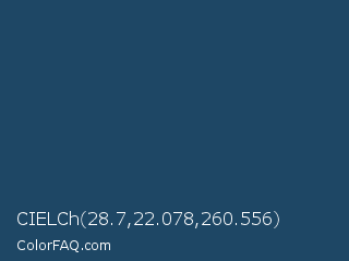 CIELCh 28.7,22.078,260.556 Color is a dark blue color and the nearest color is Cello #1e385b. Hex code #1e4765 and RGB value is rgb(30,71,101). In RGB color space, this color is composed of 12% red, 28% green, 40% blue, In CMYK color space, this color is composed of 70% cyan, 30% magenta, 0% yellow , 60% black , In HSL color space, this color has a hue angle of 205° , 54% saturation and 26% lightness.
