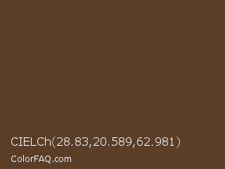 CIELCh 28.83,20.589,62.981 Color is a dark orange color and the nearest color is Irish Coffee #5f3d26. Hex code #5a3e28 and RGB value is rgb(90,62,40). In RGB color space, this color is composed of 35% red, 24% green, 16% blue, In CMYK color space, this color is composed of 0% cyan, 31% magenta, 56% yellow , 65% black , In HSL color space, this color has a hue angle of 26° , 38% saturation and 25% lightness.