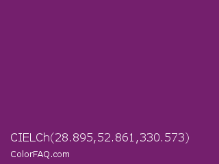 CIELCh 28.895,52.861,330.573 Color is a dark magenta color and the nearest color is Midnight #702670. Hex code #741f6d and RGB value is rgb(116,31,109). In RGB color space, this color is composed of 45% red, 12% green, 43% blue, In CMYK color space, this color is composed of 0% cyan, 73% magenta, 6% yellow , 55% black , In HSL color space, this color has a hue angle of 305° , 58% saturation and 29% lightness.