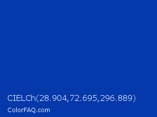 CIELCh 28.904,72.695,296.889 Color is a normal blue color and the nearest color is Royal Azure #0038a8. Hex code #0538ab and RGB value is rgb(5,56,171). In RGB color space, this color is composed of 2% red, 22% green, 67% blue, In CMYK color space, this color is composed of 97% cyan, 67% magenta, 0% yellow , 33% black , In HSL color space, this color has a hue angle of 222° , 94% saturation and 35% lightness.
