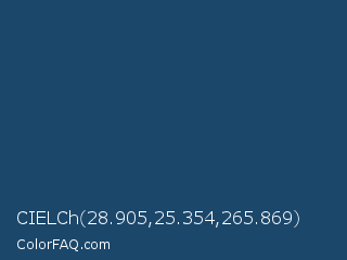 CIELCh 28.905,25.354,265.869 Color is a dark blue color and the nearest color is Chathams Blue #175579. Hex code #1b476b and RGB value is rgb(27,71,107). In RGB color space, this color is composed of 11% red, 28% green, 42% blue, In CMYK color space, this color is composed of 75% cyan, 34% magenta, 0% yellow , 58% black , In HSL color space, this color has a hue angle of 207° , 60% saturation and 26% lightness.