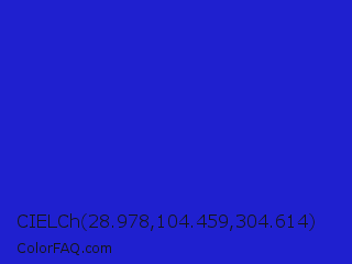CIELCh 28.978,104.459,304.614 Color is a normal blue color and the nearest color is Interdimensional Blue #360ccc. Hex code #1f20cf and RGB value is rgb(31,32,207). In RGB color space, this color is composed of 12% red, 13% green, 81% blue, In CMYK color space, this color is composed of 85% cyan, 85% magenta, 0% yellow , 19% black , In HSL color space, this color has a hue angle of 240° , 74% saturation and 47% lightness.