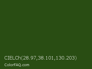 CIELCh 28.97,38.101,130.203 Color is a very dark green color and the nearest color is Green House #24500f. Hex code #294d13 and RGB value is rgb(41,77,19). In RGB color space, this color is composed of 16% red, 30% green, 7% blue, In CMYK color space, this color is composed of 47% cyan, 0% magenta, 75% yellow , 70% black , In HSL color space, this color has a hue angle of 97° , 60% saturation and 19% lightness.