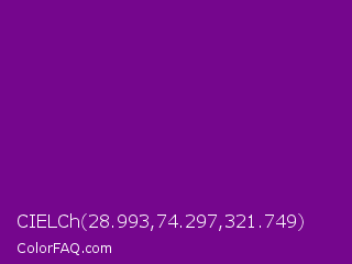 CIELCh 28.993,74.297,321.749 Color is a dark purple color and the nearest color is Patriarch #800080. Hex code #75068d and RGB value is rgb(117,6,141). In RGB color space, this color is composed of 46% red, 2% green, 55% blue, In CMYK color space, this color is composed of 17% cyan, 96% magenta, 0% yellow , 45% black , In HSL color space, this color has a hue angle of 289° , 92% saturation and 29% lightness.