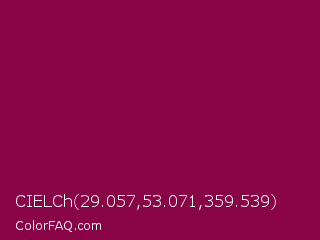 CIELCh 29.057,53.071,359.539 Color is a dark rose color and the nearest color is Rose Bud Cherry #800b47. Hex code #890447 and RGB value is rgb(137,4,71). In RGB color space, this color is composed of 54% red, 2% green, 28% blue, In CMYK color space, this color is composed of 0% cyan, 97% magenta, 48% yellow , 46% black , In HSL color space, this color has a hue angle of 330° , 94% saturation and 28% lightness.