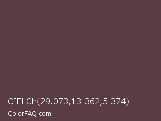 CIELCh 29.073,13.362,5.374 Color is a dark red color and the nearest color is Matterhorn #4e3b41. Hex code #593d43 and RGB value is rgb(89,61,67). In RGB color space, this color is composed of 35% red, 24% green, 26% blue, In CMYK color space, this color is composed of 0% cyan, 31% magenta, 25% yellow , 65% black , In HSL color space, this color has a hue angle of 347° , 19% saturation and 29% lightness.