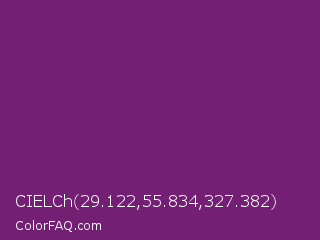 CIELCh 29.122,55.834,327.382 Color is a dark magenta color and the nearest color is Midnight #702670. Hex code #731f74 and RGB value is rgb(115,31,116). In RGB color space, this color is composed of 45% red, 12% green, 45% blue, In CMYK color space, this color is composed of 1% cyan, 73% magenta, 0% yellow , 55% black , In HSL color space, this color has a hue angle of 299° , 58% saturation and 29% lightness.