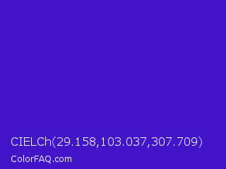 CIELCh 29.158,103.037,307.709 Color is a normal indigo color and the nearest color is Interdimensional Blue #360ccc. Hex code #4315c8 and RGB value is rgb(67,21,200). In RGB color space, this color is composed of 26% red, 8% green, 78% blue, In CMYK color space, this color is composed of 67% cyan, 90% magenta, 0% yellow , 22% black , In HSL color space, this color has a hue angle of 255° , 81% saturation and 43% lightness.