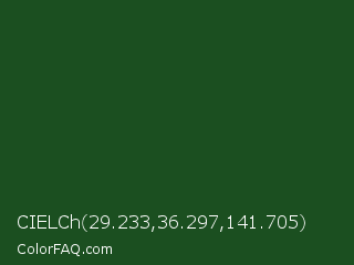 CIELCh 29.233,36.297,141.705 Color is a very dark green color and the nearest color is Parsley #134f19. Hex code #1b4f20 and RGB value is rgb(27,79,32). In RGB color space, this color is composed of 11% red, 31% green, 13% blue, In CMYK color space, this color is composed of 66% cyan, 0% magenta, 59% yellow , 69% black , In HSL color space, this color has a hue angle of 126° , 49% saturation and 21% lightness.