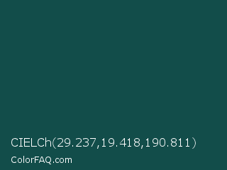 CIELCh 29.237,19.418,190.811 Color is a very dark cyan color and the nearest color is Eden #105852. Hex code #124d4a and RGB value is rgb(18,77,74). In RGB color space, this color is composed of 7% red, 30% green, 29% blue, In CMYK color space, this color is composed of 77% cyan, 0% magenta, 4% yellow , 70% black , In HSL color space, this color has a hue angle of 177° , 62% saturation and 19% lightness.