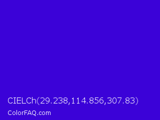 CIELCh 29.238,114.856,307.83 Color is a normal indigo color and the nearest color is Interdimensional Blue #360ccc. Hex code #3b02d8 and RGB value is rgb(59,2,216). In RGB color space, this color is composed of 23% red, 1% green, 85% blue, In CMYK color space, this color is composed of 73% cyan, 99% magenta, 0% yellow , 15% black , In HSL color space, this color has a hue angle of 256° , 98% saturation and 43% lightness.