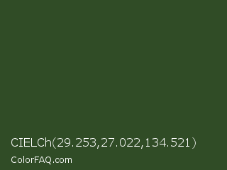 CIELCh 29.253,27.022,134.521 Color is a very dark green color and the nearest color is Kombu Green #354230. Hex code #304c26 and RGB value is rgb(48,76,38). In RGB color space, this color is composed of 19% red, 30% green, 15% blue, In CMYK color space, this color is composed of 37% cyan, 0% magenta, 50% yellow , 70% black , In HSL color space, this color has a hue angle of 104° , 33% saturation and 22% lightness.