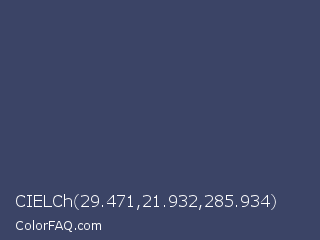 CIELCh 29.471,21.932,285.934 Color is a normal blue color and the nearest color is San Juan #304b6a. Hex code #3b4466 and RGB value is rgb(59,68,102). In RGB color space, this color is composed of 23% red, 27% green, 40% blue, In CMYK color space, this color is composed of 42% cyan, 33% magenta, 0% yellow , 60% black , In HSL color space, this color has a hue angle of 227° , 27% saturation and 32% lightness.